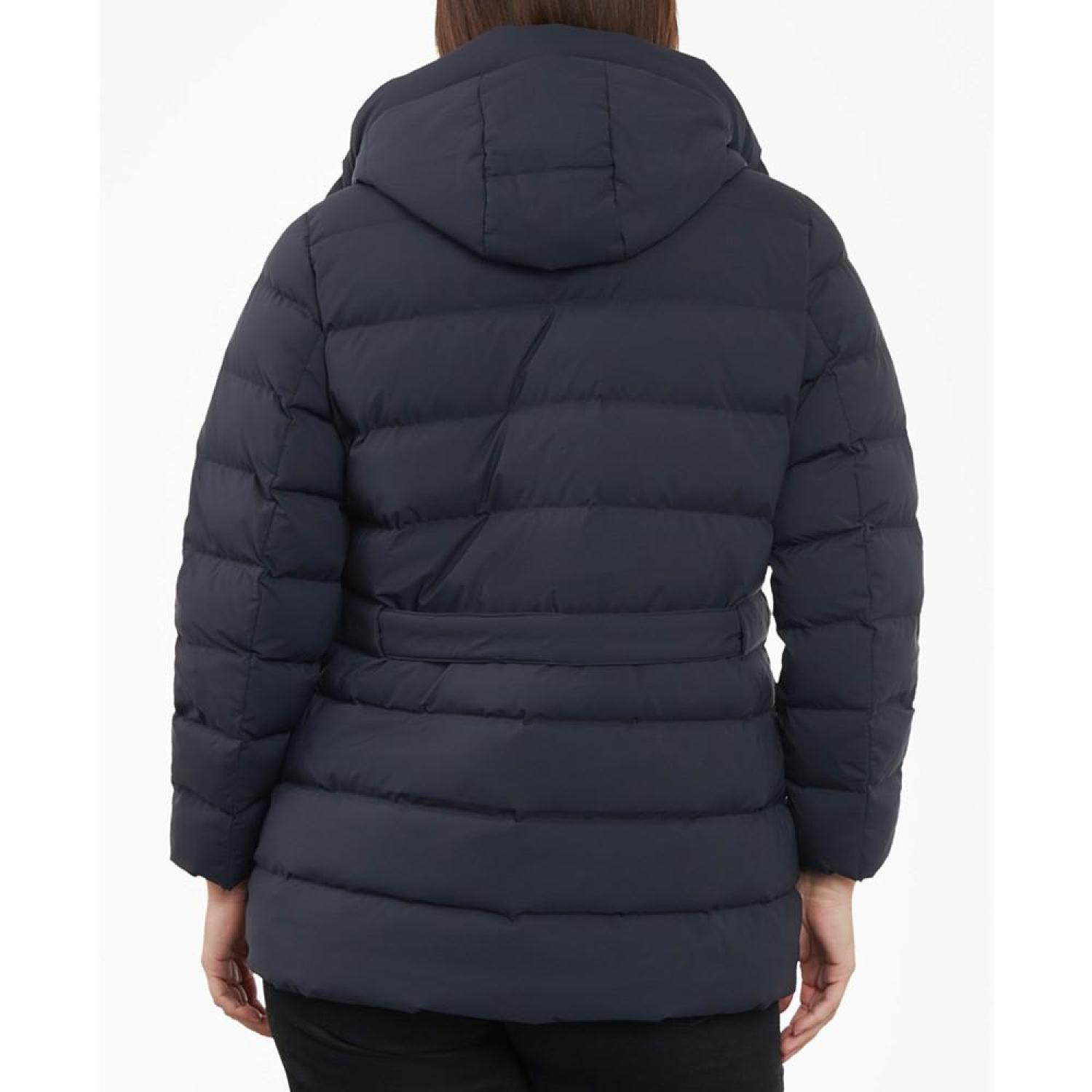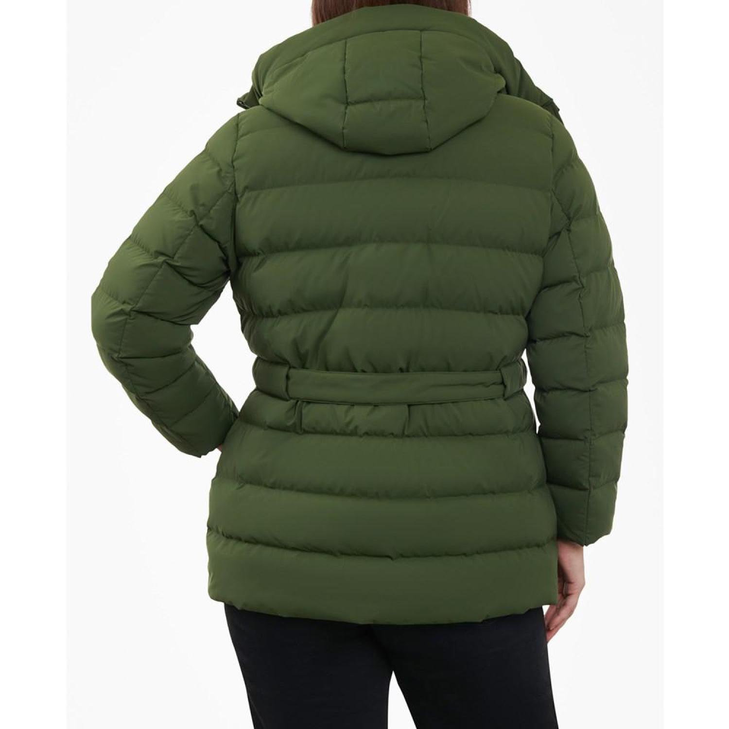 Sleek faux-leather trim adds a touch of drama to this plus size puffer coat from MICHAEL Michael Kors, a belted pick complete with faux-leather trim around each pocket.