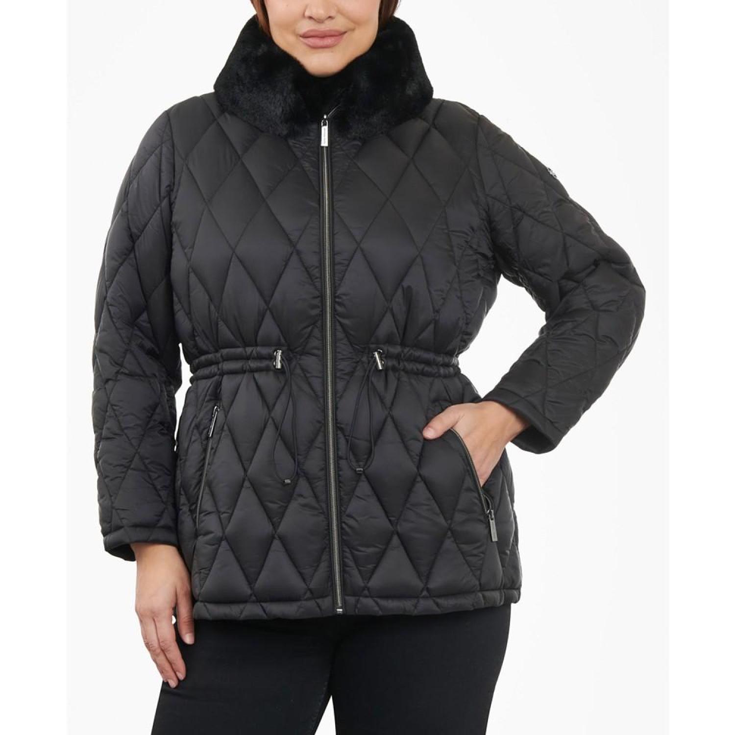 • Make a statement in this plus size coat from MICHAEL Michael Kors, a quilted anorak-inspired pick designed with chic faux-fur trim around the neckline.