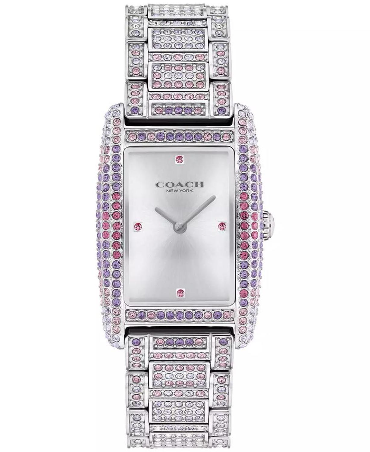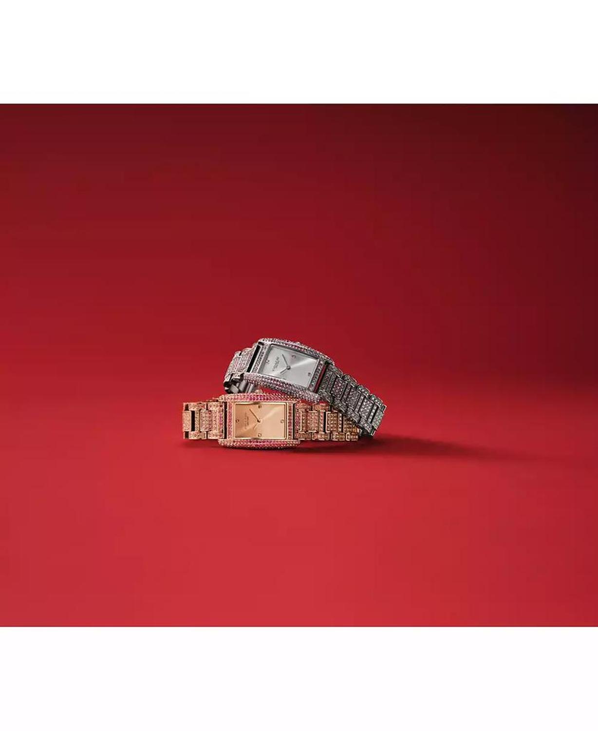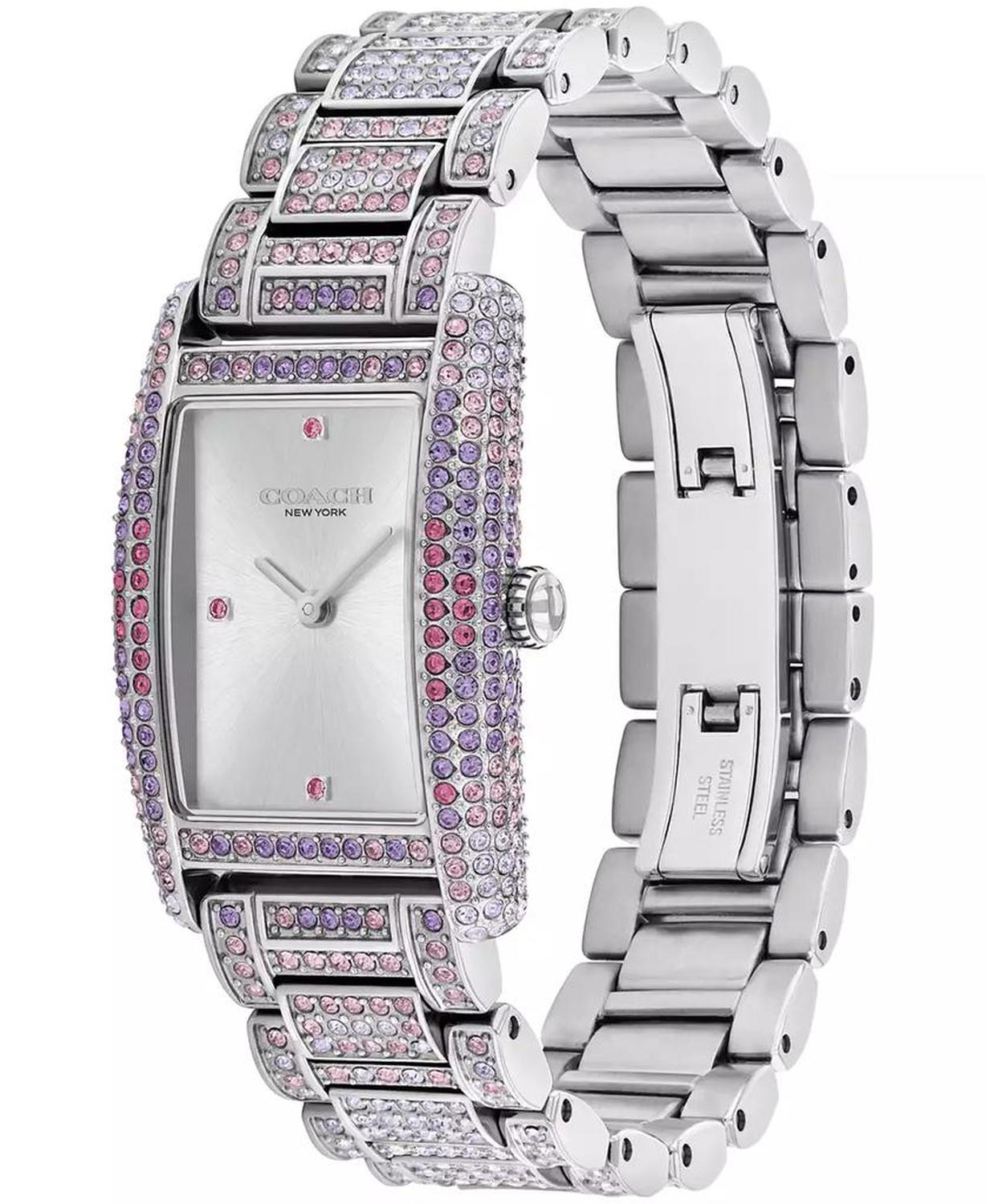 A sophisticated go-everywhere style, Reese is a sleek watch with a classic rectangle silhouette. The stainless-steel bracelet design dazzles with purple ombré pavé crystals and features a silver white sunray dial detailed with clear crystal markers. SKU 14504413