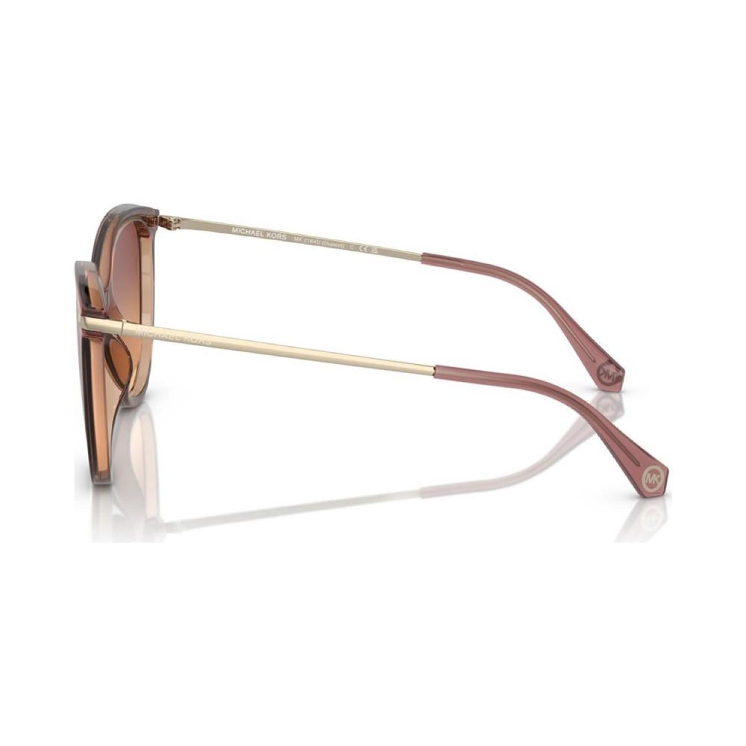 Feminine and chic, this cat eye comes in a delicate color palette ranging from clear transparent to dusty rose light brown. Mixed material feminine cat eye shape. Embossed MICHAEL KORS logo on temple tip. Iconic brand allure.