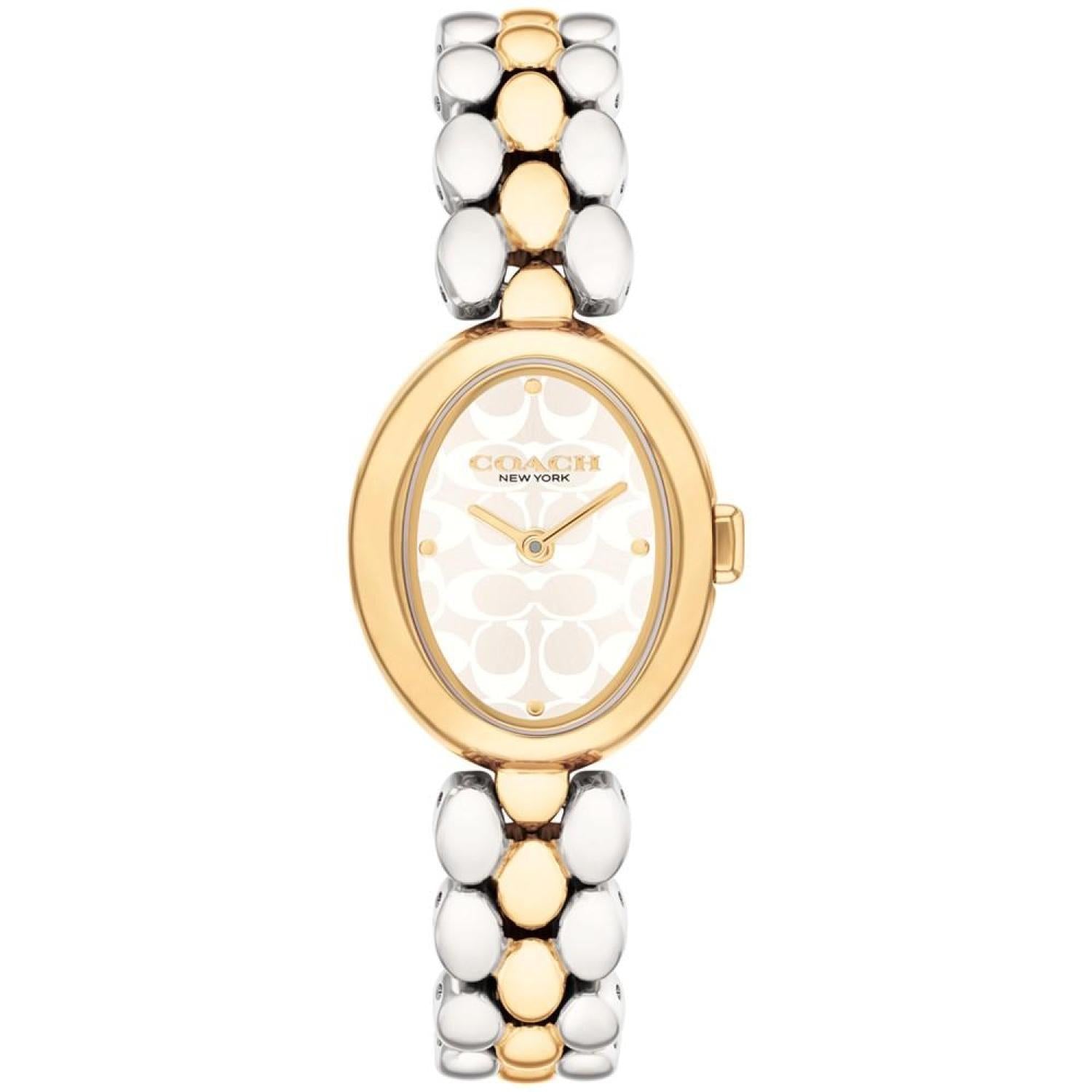 Designed with a modern minimalist sensibility, the Sammy is a refined timepiece perfect for every day. This two-tone stainless steel and gold tone bracelet watch features a silver white Coach Signature dial detailed with polished gold tone markers. Style 14504419