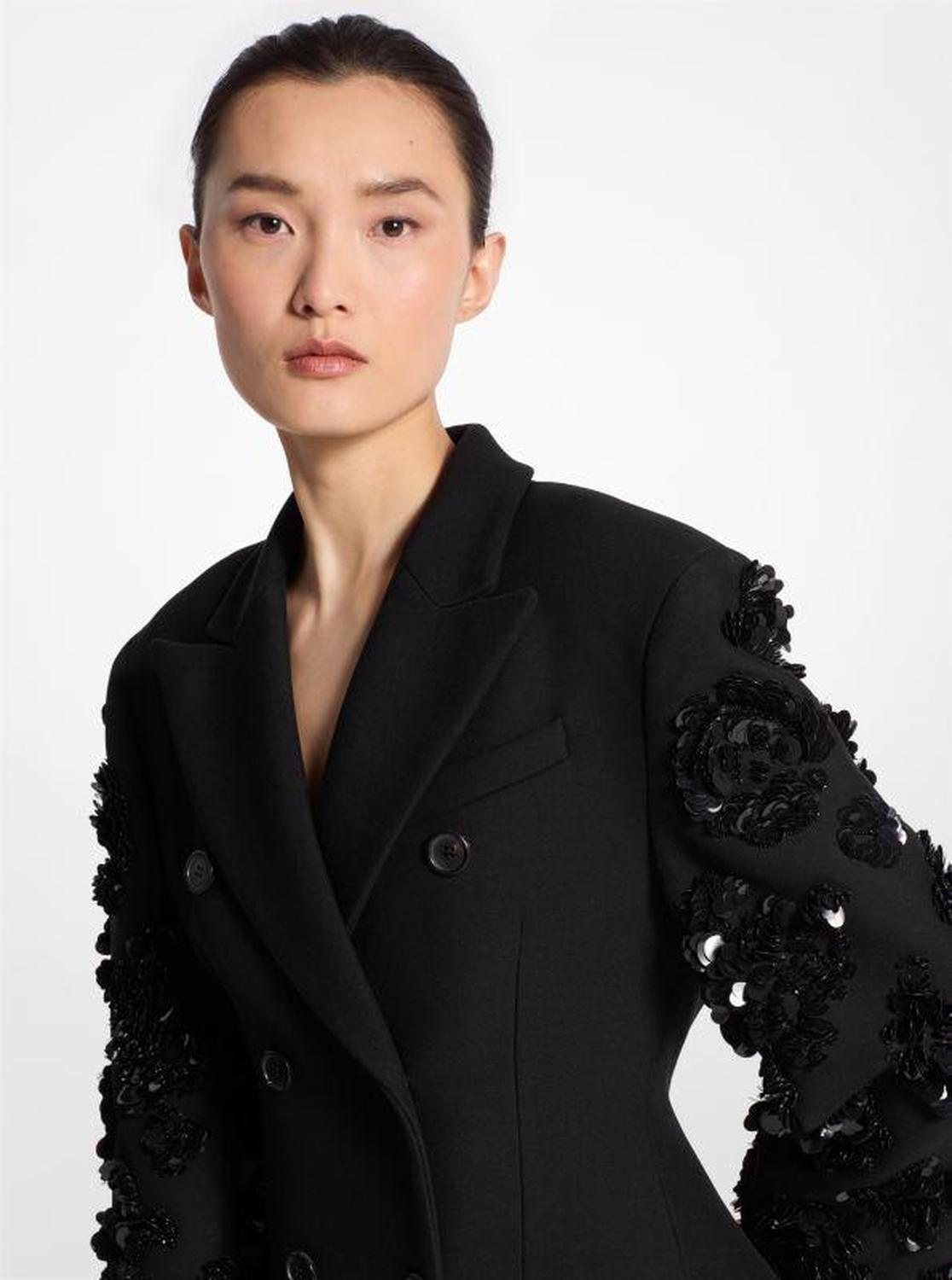 Made in Italy from sculptural wool gabardine, this double-breasted jacket is destined to be your new eveningwear hero. It features precise tailoring that offers a softly carved-out waist and structured shoulders for a strong silhouette. Hundreds of hand-embroidered sequins at the sleeves finish it with luxurious femininity.