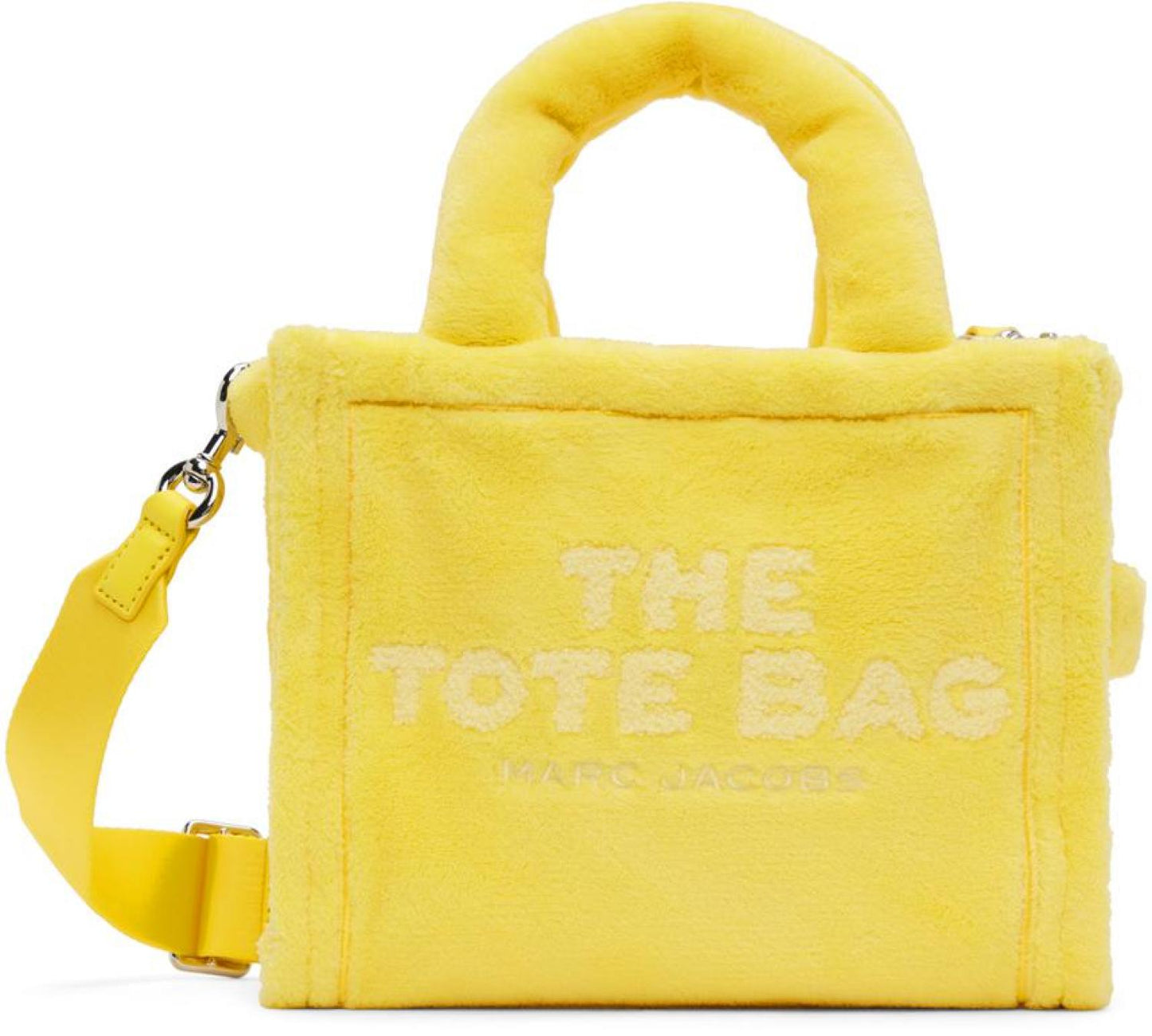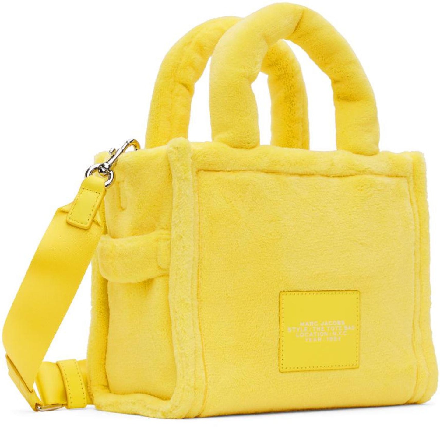 Terrycloth tote in yellow. Intarsia logo and text at face.