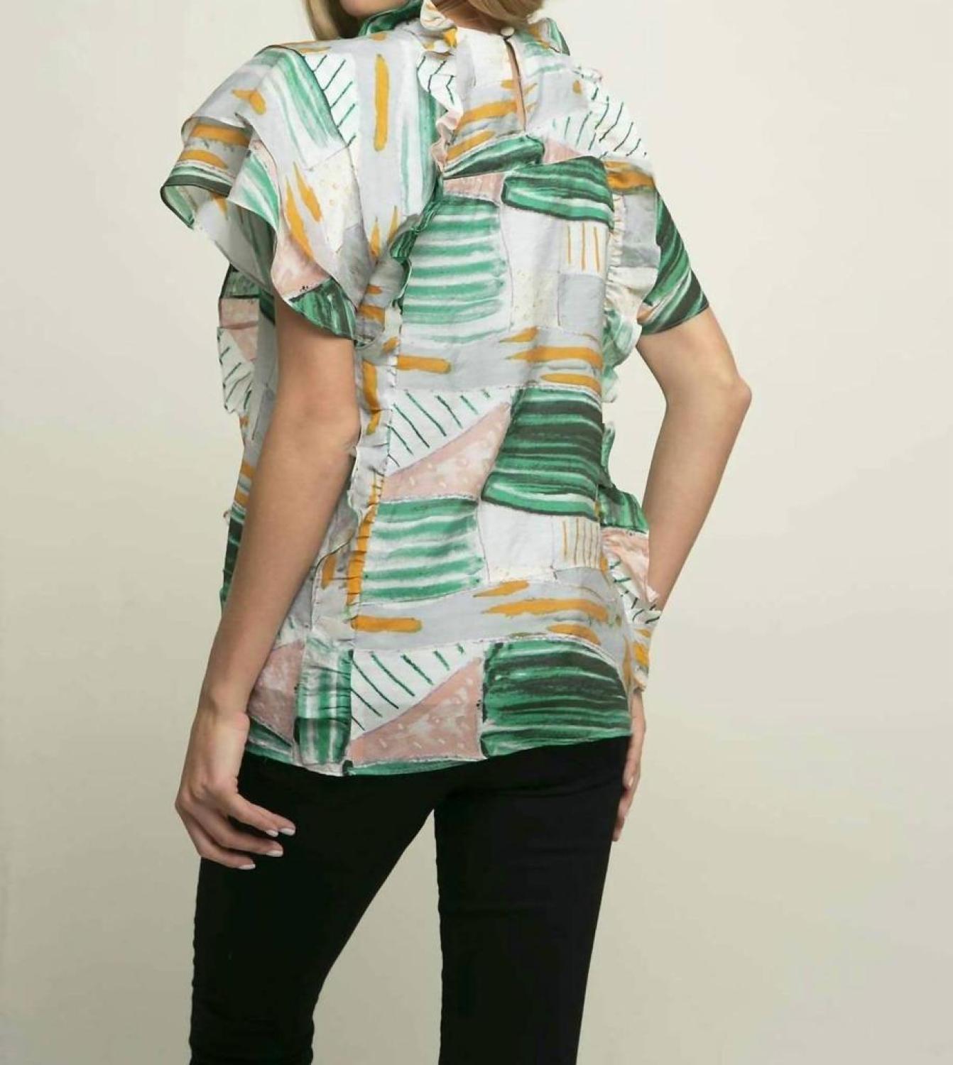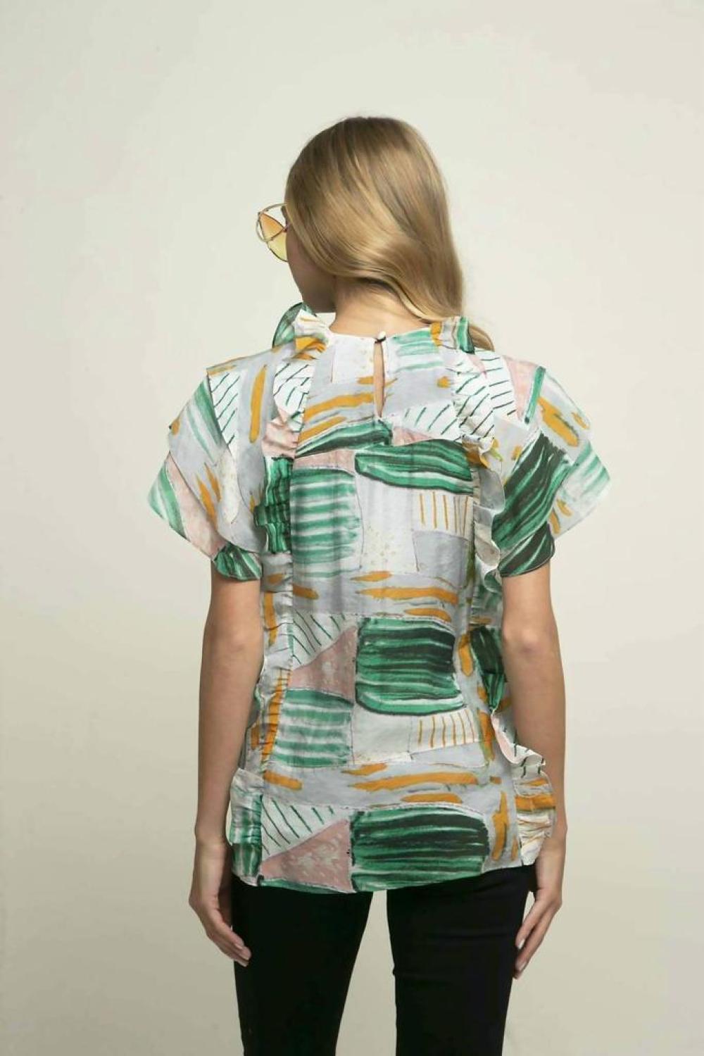 A timeless blouse that will never go out of style.The pull-over style has a button and loop closure at the nape of the neck, layered angel sleeves and rows of ruffles down the front and back. Rum Baba abstract print that blends shades of green, gold, pink and gray. 85% Rayon 15% Acrylic. Hand wash only. Made in Los Angeles, USA.